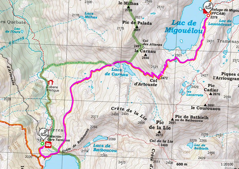 Etapa 1: Fabrèges (Estación de Artouste), telecabina, Petit Train d’Artouste, Lac d’Artouste, Lacs de Carnau, Col d’Artouste, Lac de Migouélou y Refugio de Migouélou