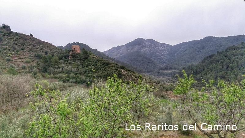 Salimos a la carretera CV-215 por la que circulamos unos metros para entrar por el camino cementado que da acceso a los Casales, nombre actual del conjunto de la alquería islámica de la Alfándiga. Subimos por el camino del Bco. de la Rocha y en el último campo antes de que el camino gire a la izquierda bajamos por la senda empedrada, cruzar el barranco y acceder a la loma que da acceso a la torre. Catalogada como BIC, formaba parte de la estructura defensiva del castillo de Almonacid y permitía controlar la entrada al valle desde Alcudia de Veo. Es de planta cuadrada y construida en tapial de mampuestos sobre una base de sillarejo que la nivela sobre el terreno. En la actualidad ha perdido su coronamiento y los forjados interiores. Para acceder al interior hay que hacer una pequeña trepada. Volvemos al camino para seguir por la loma de Lucas, cruzar el barranco del Puentecico y bajar a la fuente de Donace por el camino de Zorrilla. De aquí al pueblo para cerrar la ruta circular.