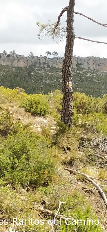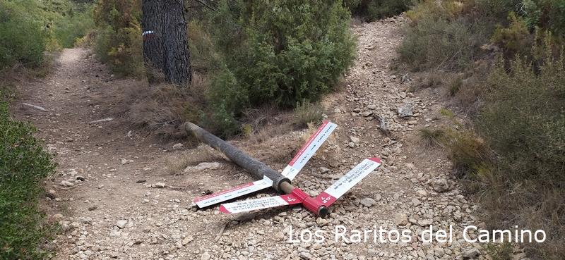 Después de coger agua, el camino hoy va a ser largo, nos dirigimos por el GR 7 a la Sierra Martés, subimos hasta el Camino de la Sierra, donde buscamos el inicio del PR-CV 250, ya sólo nos queda seguir las marcas blancas y amarillas, o eso quisiera, lo hacemos de bajada a la Aldea de El Oro siguiendo el camino de la Sierra hasta la CV-425, la seguimos unos metros y la dejamos a nuestra izquierda por un terraplén de la carretera, empiezan las cosas raras.