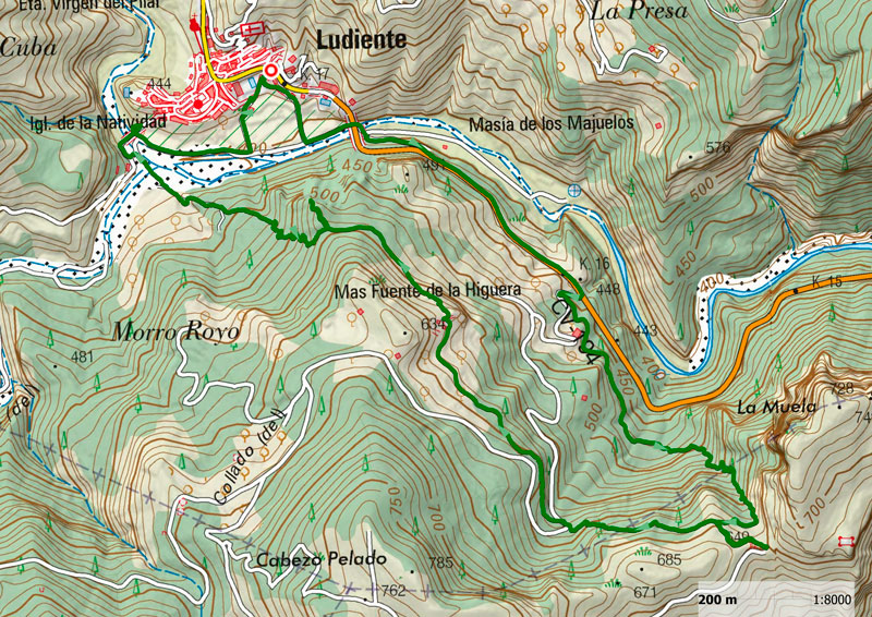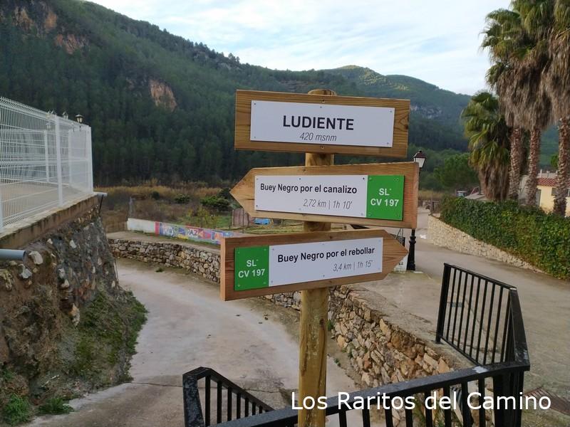 Buey Negro por el Canalizo, río Villahermosa, carretera CV-194, camino del Collado, el Canalizo, collado del Corral de las Matildas, senda del Buey Negro, camino del Collado, Fuente de la Higuera, Masía de la Fuente de la Higuera, el Rebollar, Corral del Río, Molino de Abajo, río Villahermosa, Ludiente.